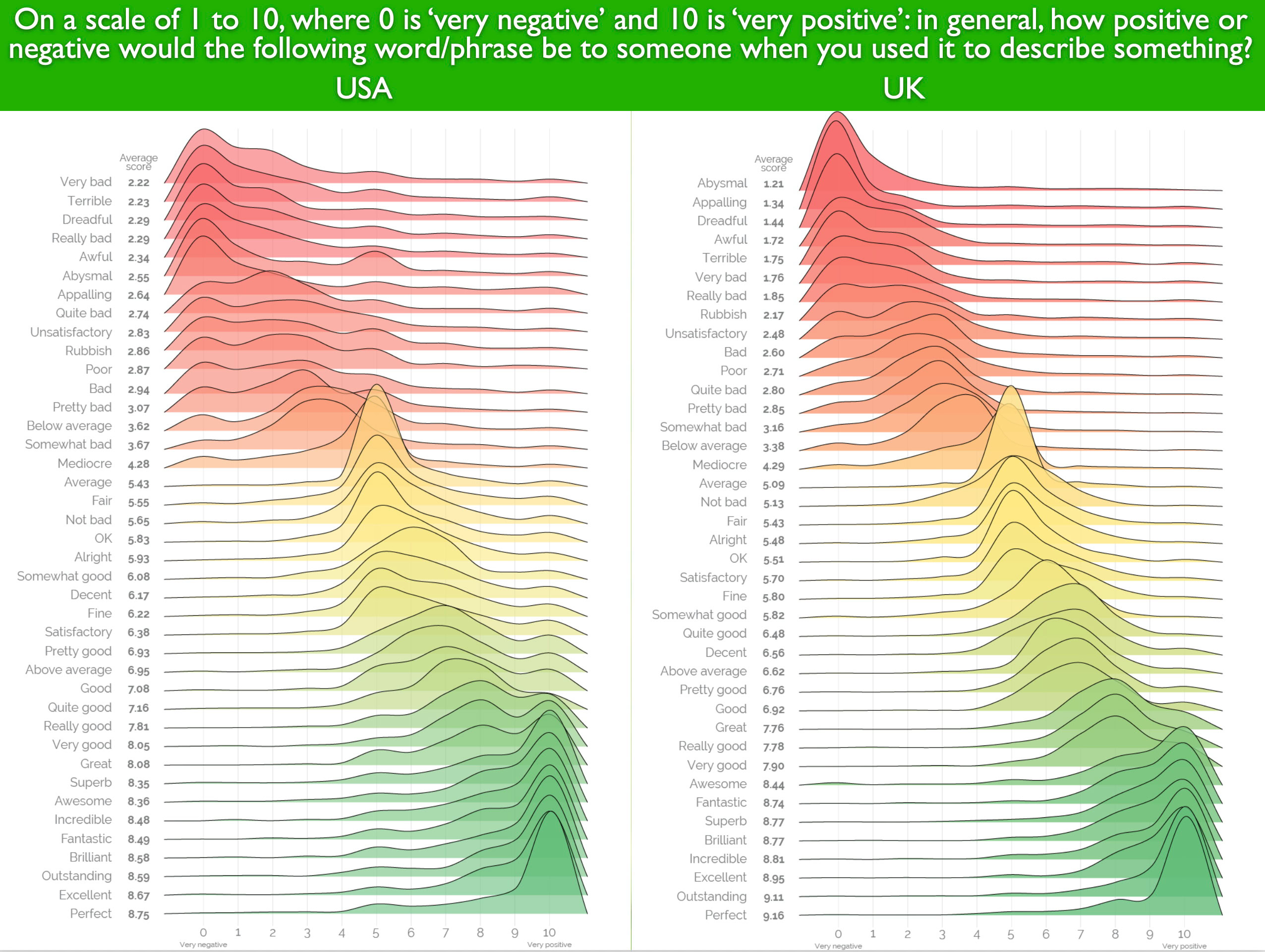 For example, a study by YouGov in 2018 documented what anyone who has worked in international environments knows well: people in the UK and the US have quite different understandings of words that express positive and negative opinions. YouGov tested 40 words that ranged from “abysmal” at the negative end of the spectrum to “perfect” at the positive end, and found that people in the US tend to be somewhat more hyperbolic when expressing positive opinions.