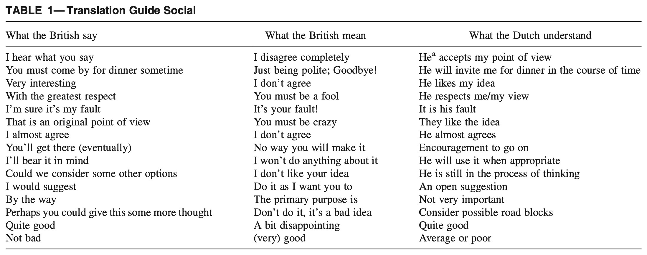 However, misunderstandings are not restricted to the alleged gap between American hubris and English diffidence. In numerous articles, Nanette Ripmeester compares the use of language by British and Dutch speakers of English. She notes that British speakers make extensive use of paradoxical meanings that may cause confusion for people from different cultures such as the Dutch, whom she characterises as being “renowned for their directness”. She offers the following comparative tables to illustrate the challenges which arise in both social and professional settings: