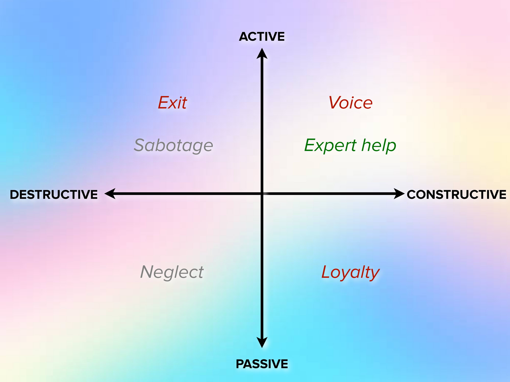 Hirschman’s thesis is that members of any organisation – whether a business, a political party, a nation or a school board – essentially have two possible primary responses when they perceive that the organisation is encountering a decline. They can either exit (withdraw from the relationship), or, they can voice (attempt to repair or improve the relationship through communication of the complaint, concern, grievance or proposal for change). Hirschman then argues that the individual’s level of loyalty will affect the decision whether to exit or to voice – high loyalty reduces the likelihood of exit while increasing the likelihood of voice.