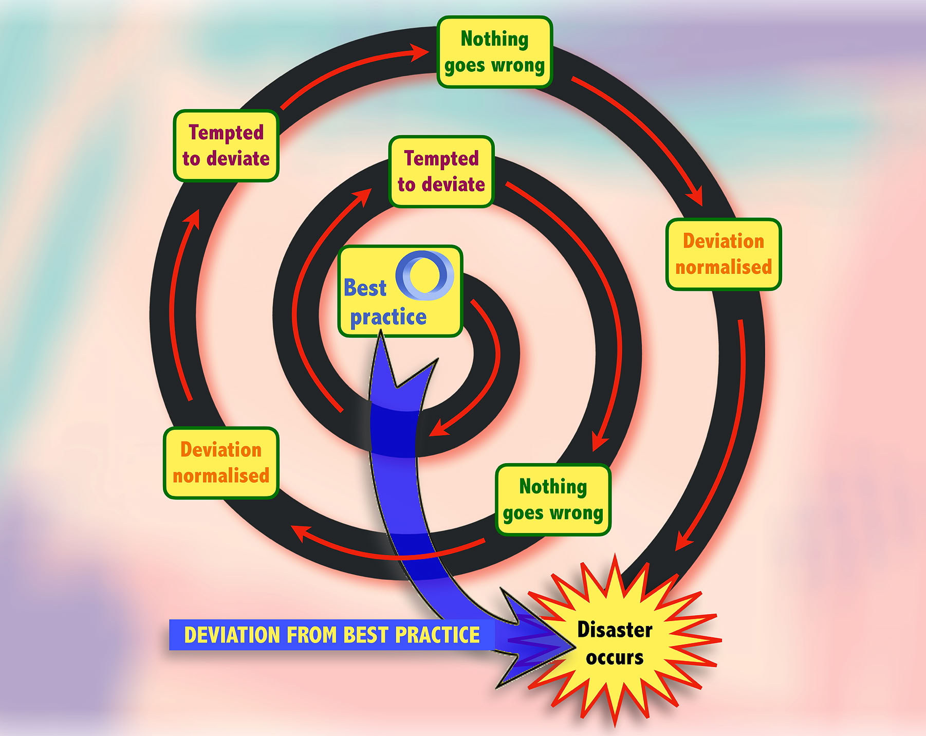 It is easy to see how each of these situations can lead to disaster – a crushed skull on a construction site, a major traffic accident or loss of licence for a driver, or serious identity theft for the generous student. There are many other scenarios where the process and the consequences of normalisation of deviation can be seen – smoking, hand washing, closing farm gates, ignoring fire alarms, by-passing safety checklists, cutting corners with background and reference checks, and so on.