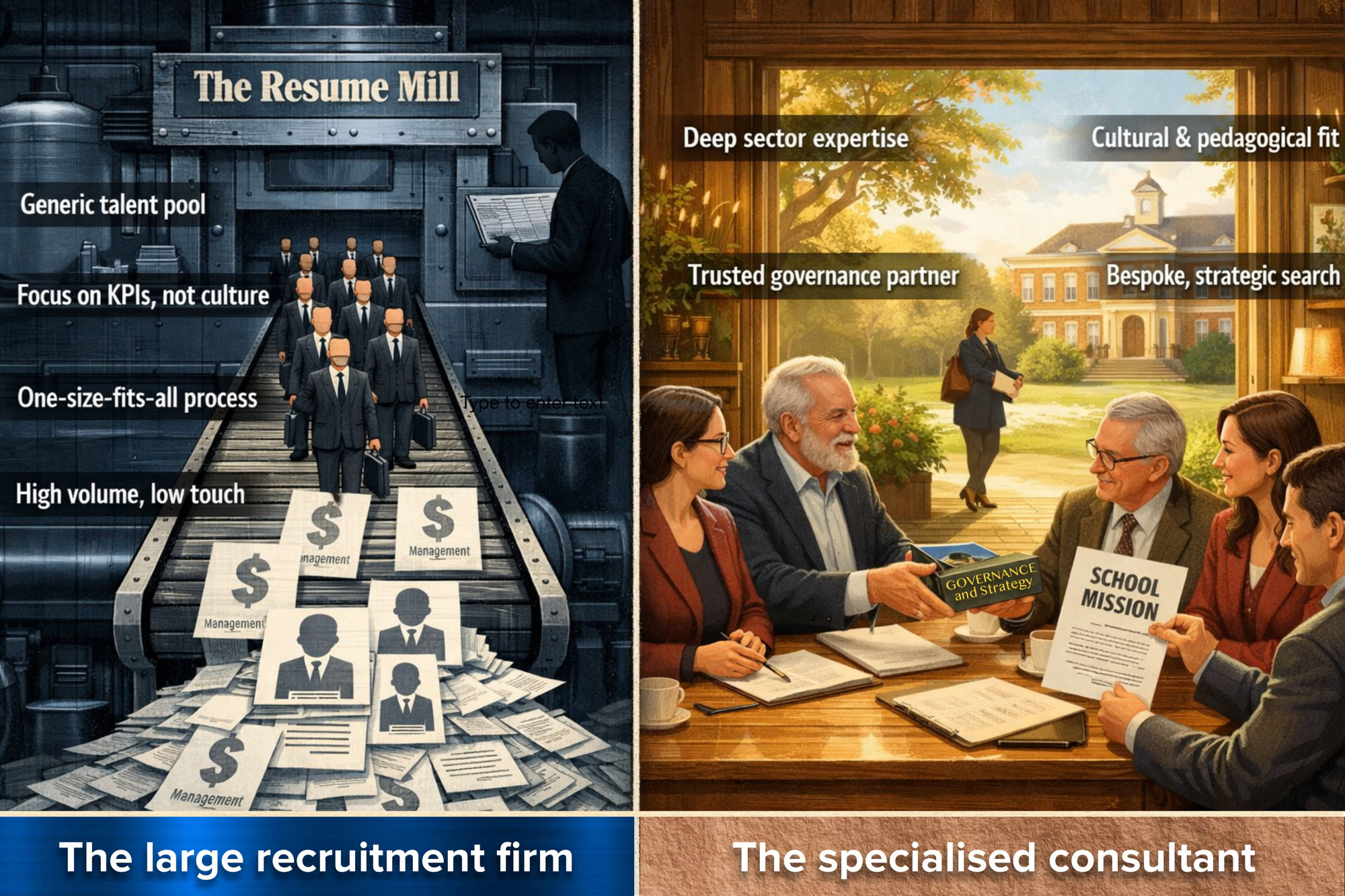 - Governance blind spots: Many large recruitment firms lack experience with the unique governance structures of independent and international schools such as parent-elected boards, foundation boards, etc, which require specific skills in board relations, communication, and strategic leadership within a non-profit educational context.