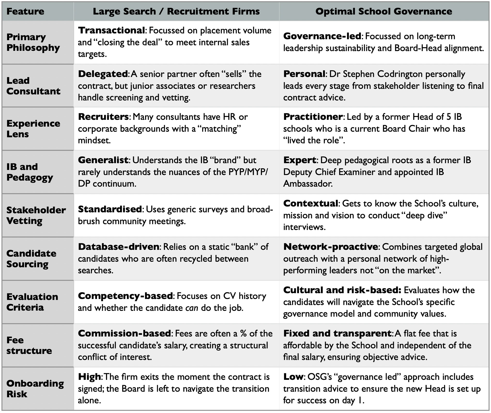 Footnote: Historically, Optimal School Governance has only conducted Head of School recruitments for existing and previous clients. We are now open to enquiries from all international and independent schools. Our work contrasts with large search firms in the following ways: