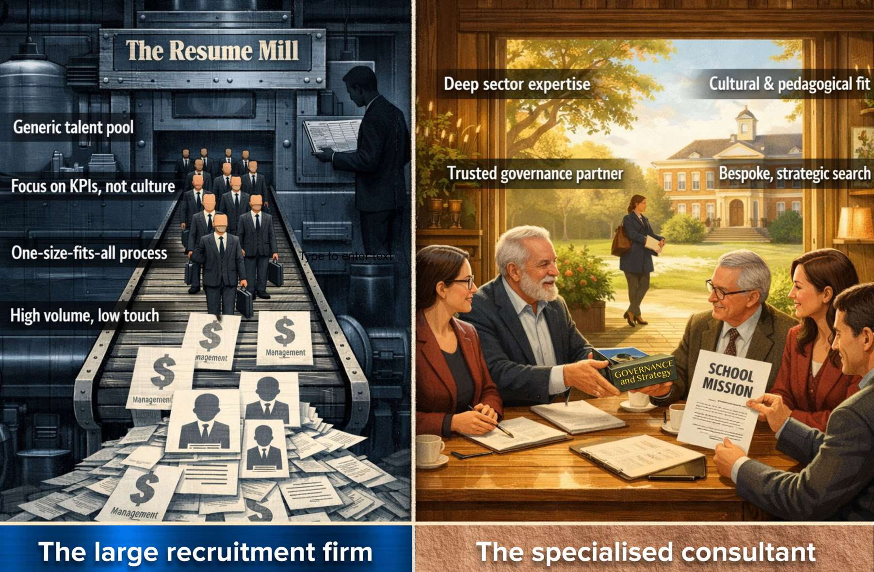 It is really the difference between high-touch, governance-led recruitment using a specialist consultant with extensive educational leadership experience on one hand, or high-cost, transactional recruitment using low-touch standardised procedures on the other. It’s essentially a choice between scale and substance.