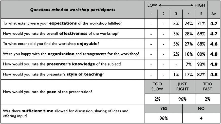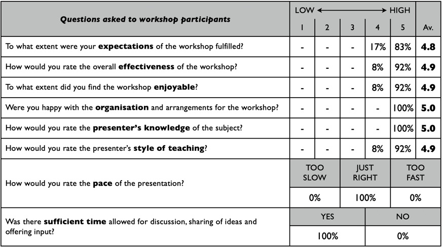 •Many thanks indeed for delivering your much appreciated and highly beneficial workshop yesterday. It was a real pleasure to meet you; all my fellow participants and I found the workshop stimulating, effective and – above all – very enjoyable: you treated us to a veritable feast of helpful suggestions, ideas and action points which we’ll be going through in further detail in the weeks ahead. You’ve given our school enormous assistance and support through the training we received yesterday, and we’re all most grateful.