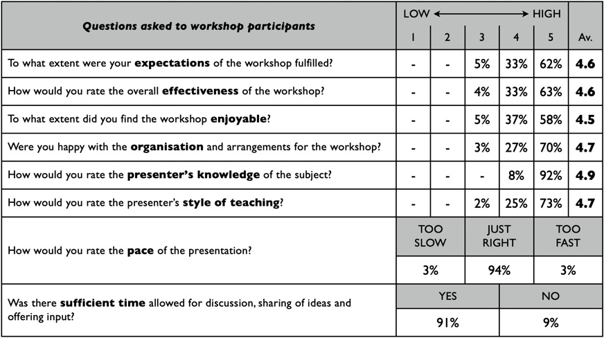 •The workshop was presented in an engaging way at a good pace that allowed discussion time.