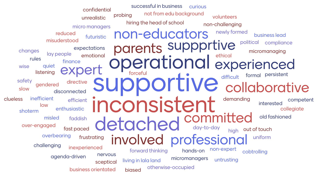 As you can see in the word cloud that was generated, senior leaders in schools across multiple locations have widely diverse experiences with their boards. Although “supportive” was the most common word used, being provided by 18% of respondents (or 21% if we include several who typed “suppprtive”), it is fair to say that most responses fell a long way short of expressing ecstatic enthusiasm for their boards, and on balance there were more negative words than positive.
