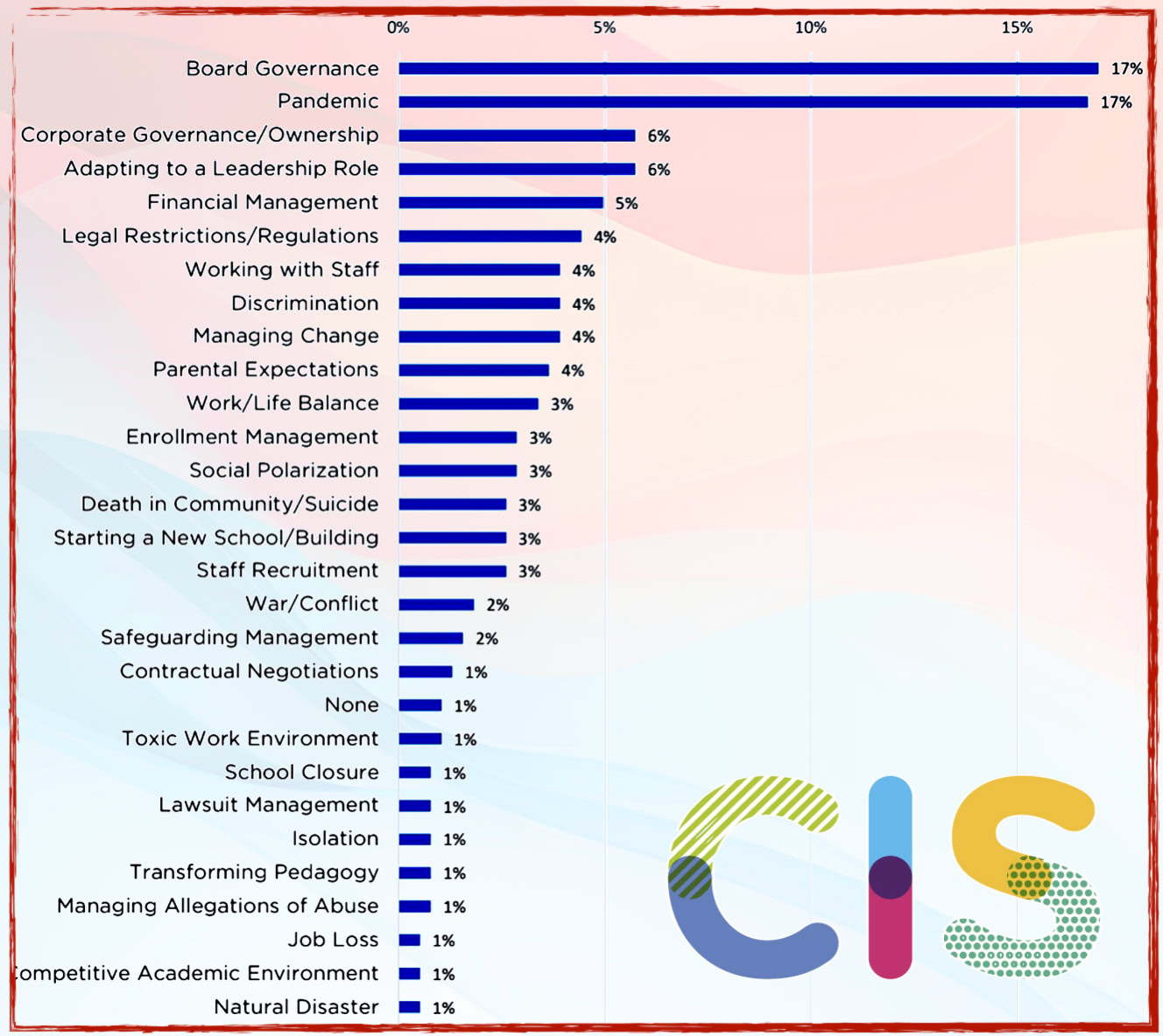 Even before the two factors embracing governance (“Board Governance, 17.2%” and “Corporate Governance/Ownership, 6.0%”) are combined, we can see that governance presented a greater professional challenge to Heads of Schools than a global pandemic (16.8%).