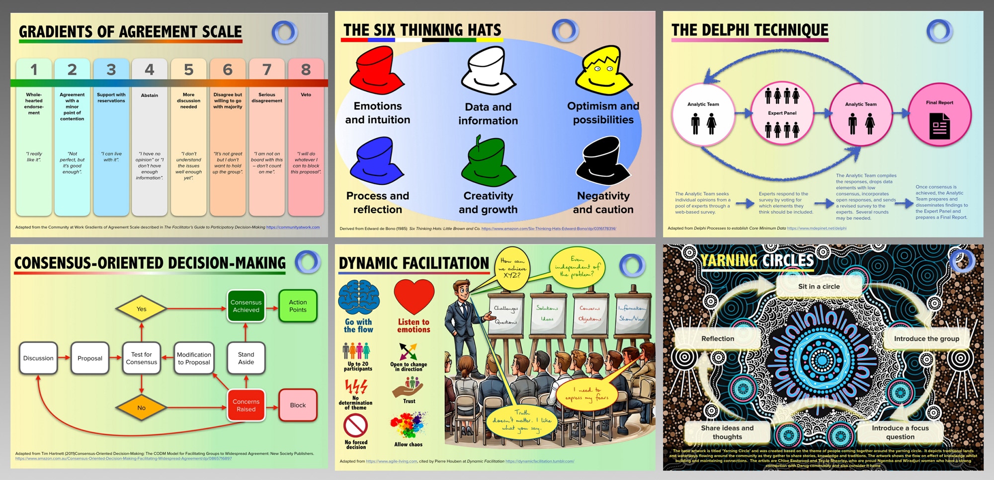 Developed in the early 1980s by Jim Rough, the Co-founder of the Centre for Wise Democracy, Dynamic Facilitation contrasts starkly with structured approaches such as CODM and the Delphi Technique. Dynamic Facilitation is “a choice-creating process” that encourages free-flowing dialogue and creative problem-solving while guiding participants toward a shared resolution. Rather than following a rigid structure, a facilitator actively listens, captures key points, and helps individuals express their perspectives without judgment. Disagreements are directed at the facilitator rather than the person who expressed them, and the facilitator responds by welcoming and validating all viewpoints. This approach opens the way for underlying emotions to be explored safely, transforming conflicts into innovative solutions using four charts: solutions, concerns, data, and problem-statements. Dynamic Facilitation is said to be especially useful in situations where participants have deeply entrenched opinions or emotional stakes in the outcome.