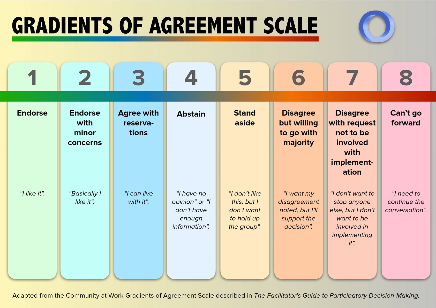 The idea behind Gradients of Agreement is that issues are rarely clear-cut yes/no matters. Rather than forcing meeting participants into one of two polar opposite positions, Gradients of Agreement offers a framework to identify and label degrees of support or opposition for any proposal being discussed.