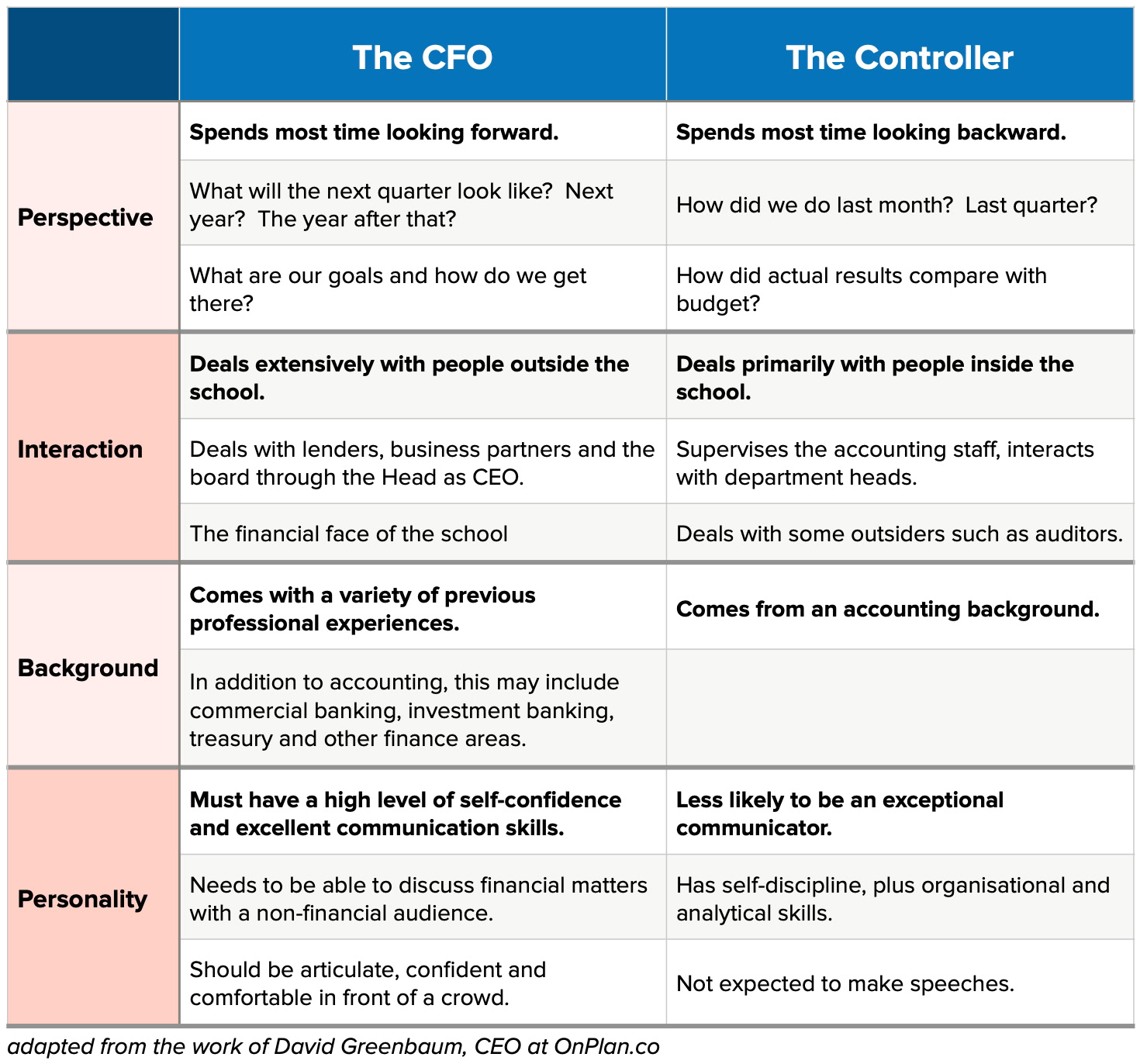 Having said this, it is important to remember that not all Finance Officers are equivalent – the job descriptions of Finance Officers can vary widely from school to school. Some Finance Officers perform as CFOs, whereas others are more focussed on day-to-day operations: