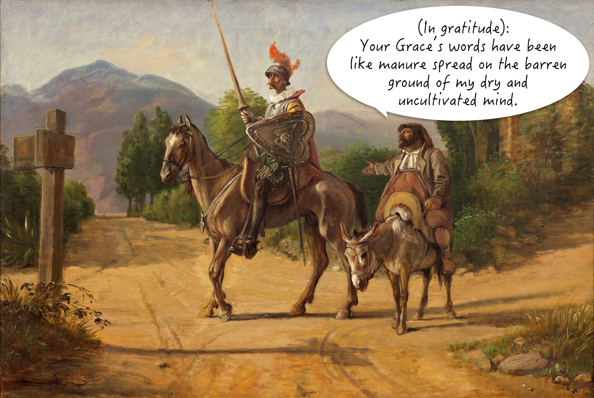 One such discussion includes the barbed compliment shown in the overlay to Marstrand’s painting above. Sancho is telling Quixote that his words have been the manure that has fertilised the dry soil of his intellect: “Some of your Grace’s wisdom has got to rub off on me, for land that’s dry and unfruitful will give you good crops if you put on enough manure, and weed it, and till it. I mean, your Grace’s words have been like manure spread on the barren ground of my dry and uncultivated mind” (“Don Quixote”, Part 2, Chapter 12).