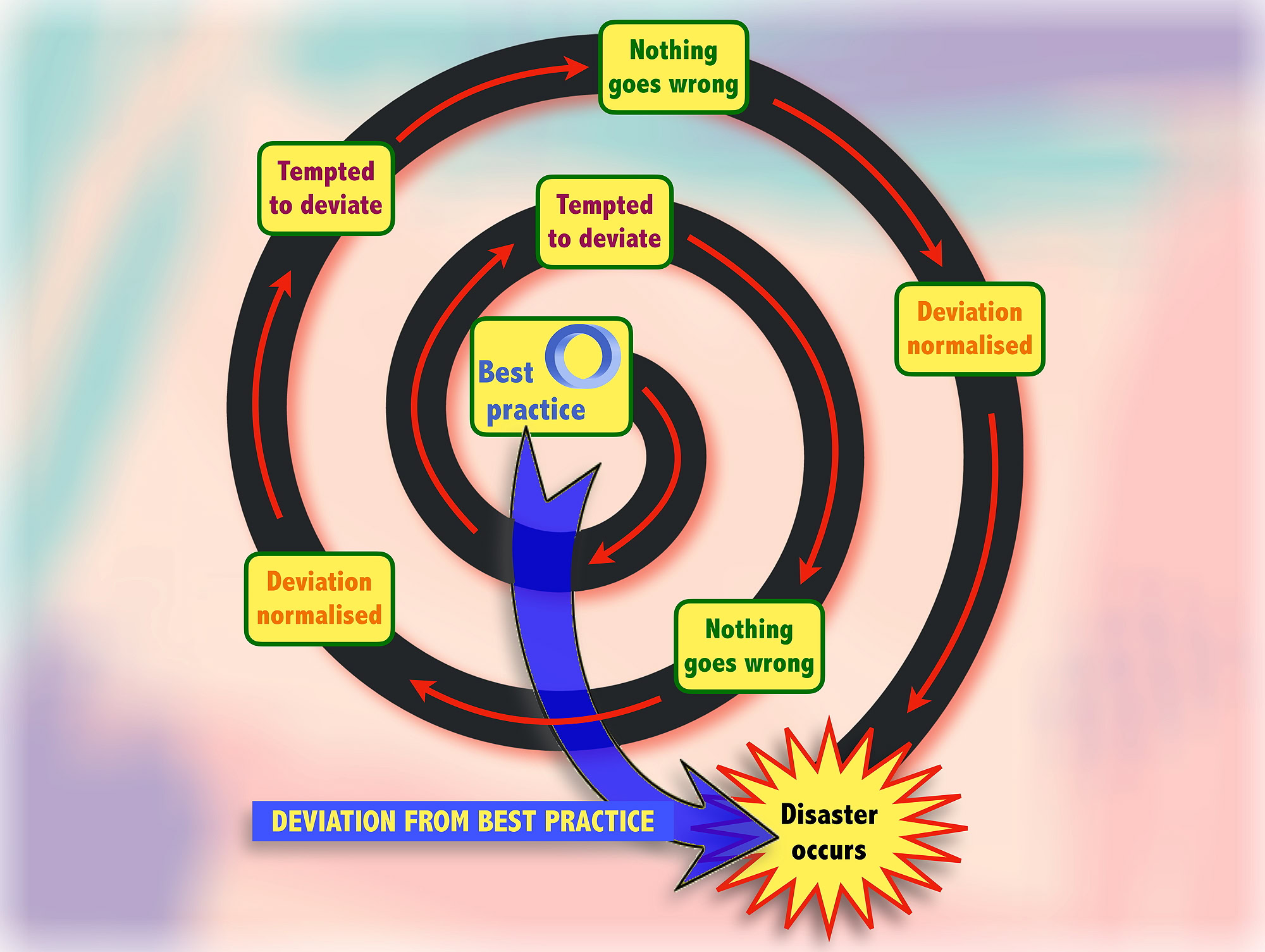 It is easy to see how each of these situations can lead to disaster – a crushed skull on a construction site, a major traffic accident or loss of licence for a driver, or serious identity theft for the generous student. There are many other scenarios where the process and the consequences of normalisation of deviation can be seen – smoking, hand washing, closing farm gates, ignoring fire alarms, by-passing safety checklists, cutting corners with background and reference checks, and so on.