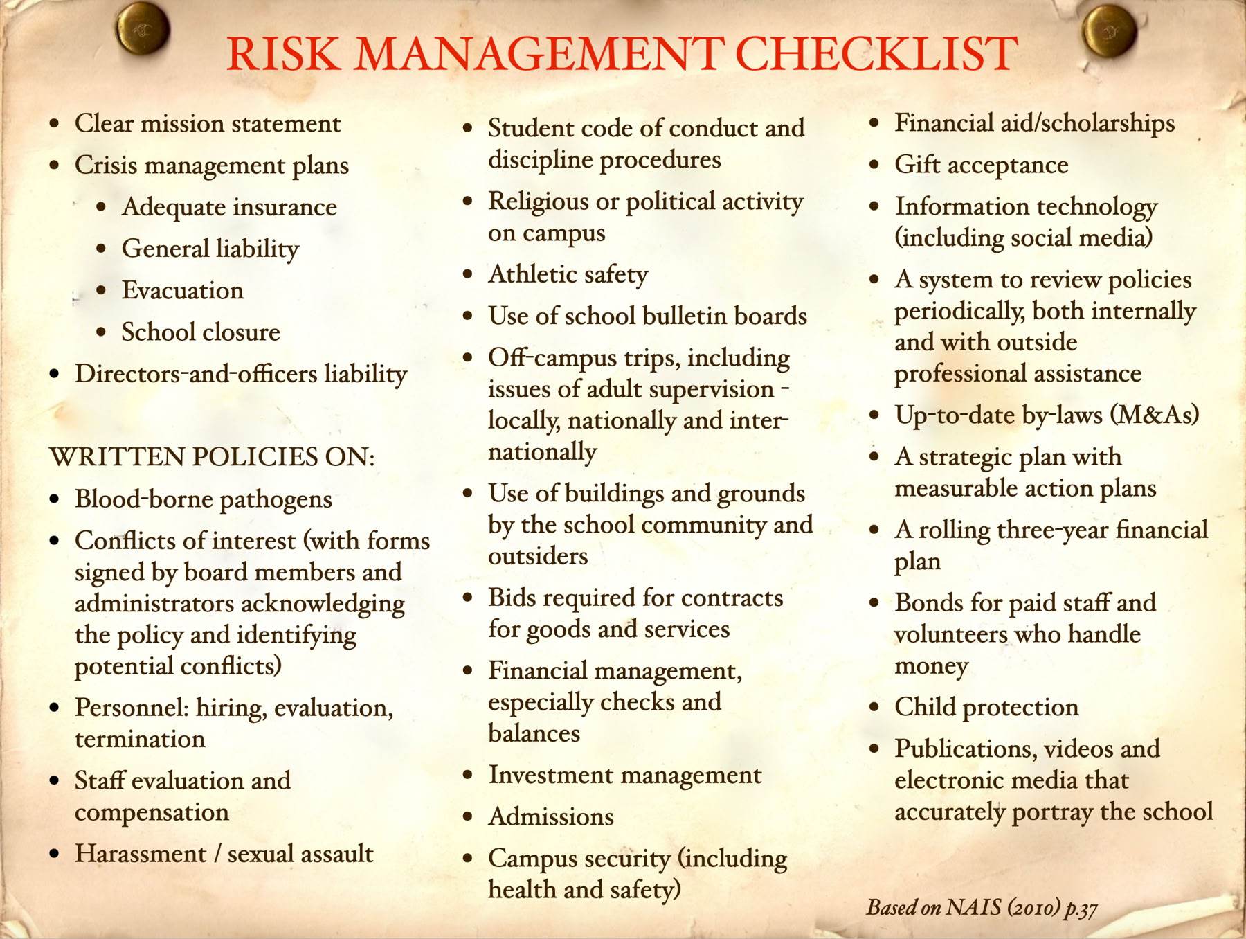 For a school board, risk can be viewed as anything that impedes, or has the potential of impeding the school achieving its strategic goals. Ensuring that risk is managed effectively is one of the key fiduciary duties of a school board as it seeks to direct and protect the school.