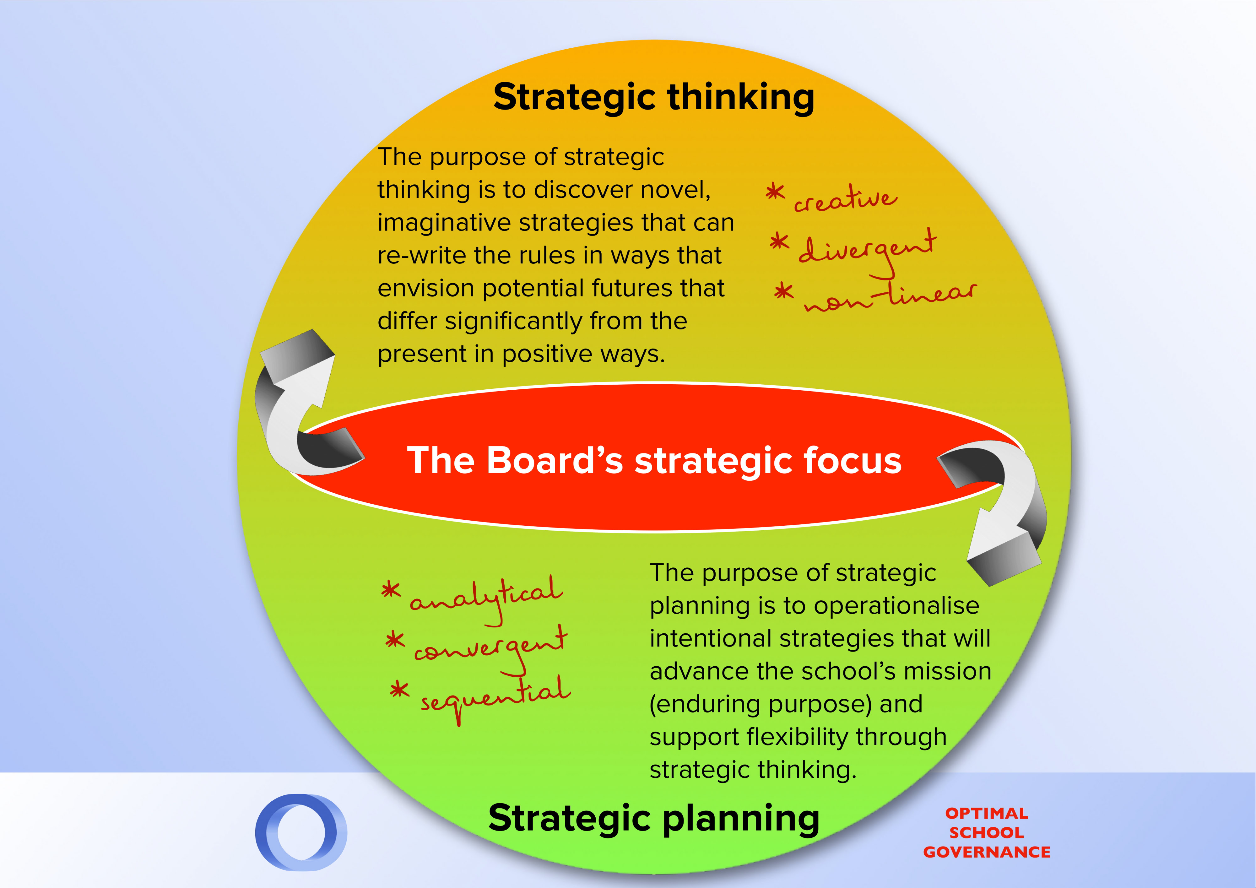 Strategic thinking is NOT the same thing as strategic planning, and indeed strategic planning can become an impediment to strategic thinking if not handled appropriately. Many members of school boards feel more confident if they stay within their comfort zone of thinking operationally – planning, monitoring and executing – while at the same time acknowledging that they would like to develop more future-focussed strategic skills.