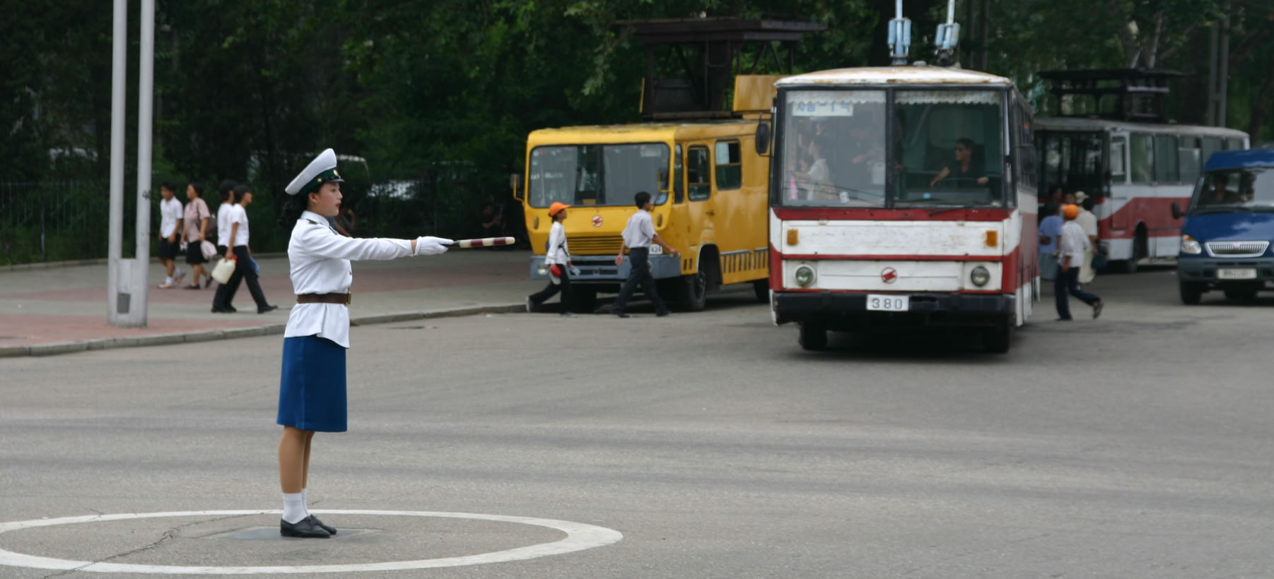 I took this photo on one of my visits to Pyongyang.It shows a policewoman at the intersection of Victory Street and Somun Street near Kim Il Sung Square in the heart of the city.The baton held out horizontally indicates that a turn through the intersection is permitted.