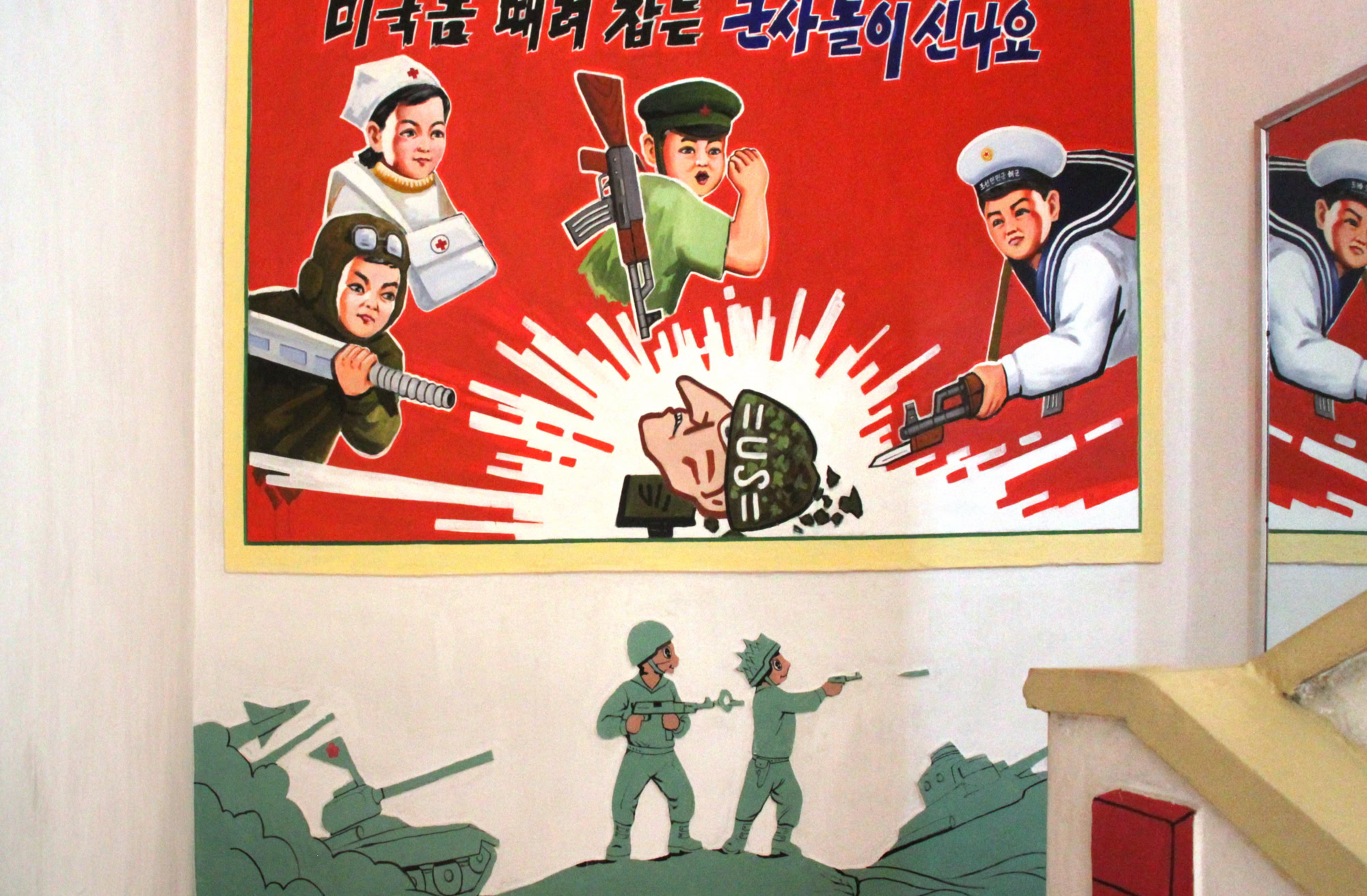 “Are you excited about the military game of beating up Americans?” is the slogan on this wall display on a staircase landing in the Kindergarten on Chonsamri Co-operative farm, near Kangsŏ, North Korea.